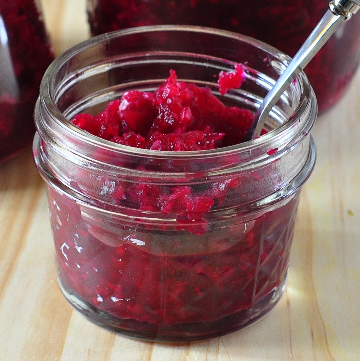 Do you love beets? How about pickle-y, crunchy, delicious things that are kinda spicy? Then I suggest you get your hands on some beets and make this yummy stuff. My recipe is not as sweet as others I have seen, and you can vary the heat by decreasing or increasing the amount of horseradish. It can be canned, but it will also keep for months in the fridge.